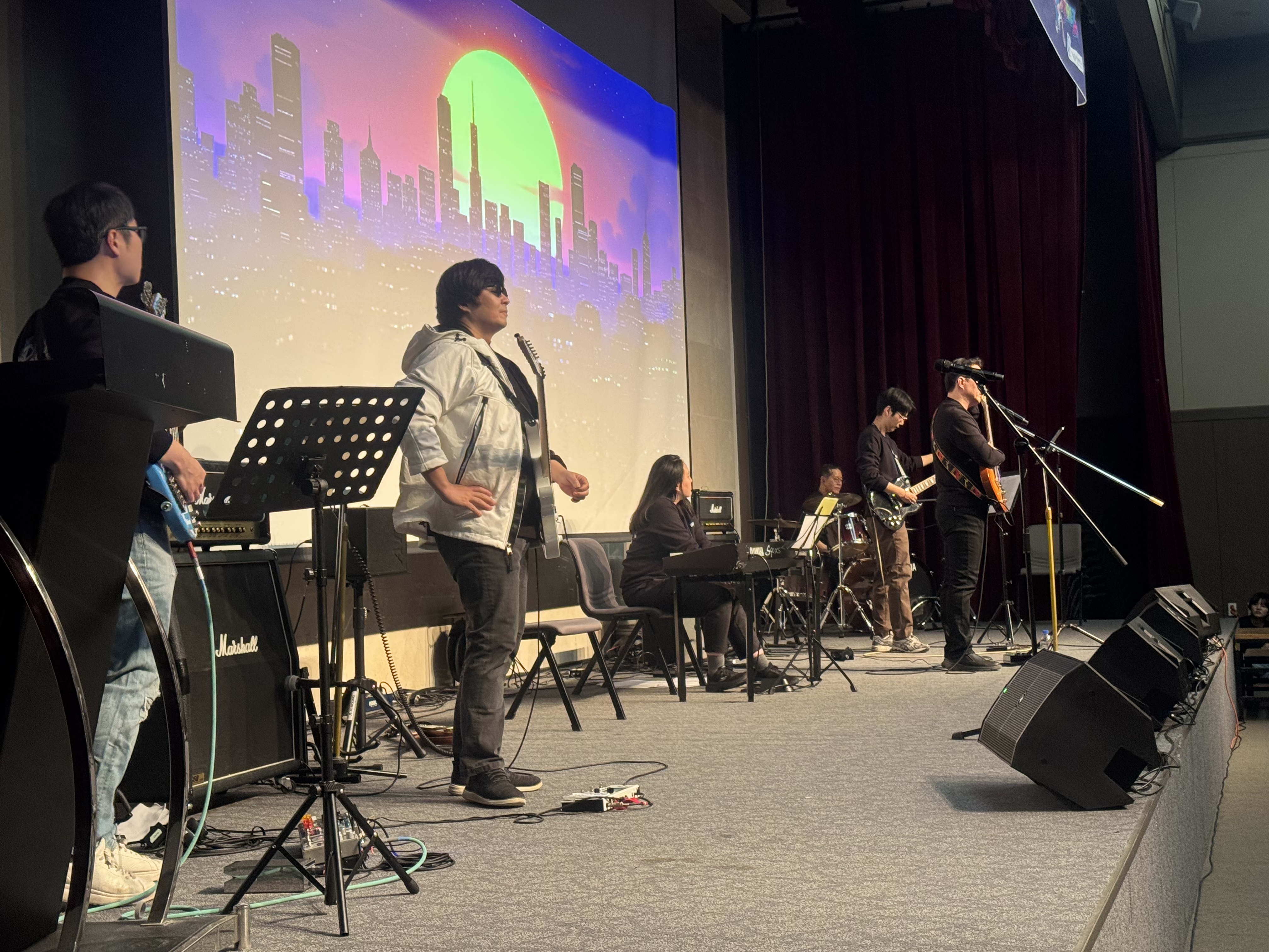 밴드악기는 드럼, 기타앰프, 베이스앰프, 신디사이져 상급형으로 준비 해드렸으며